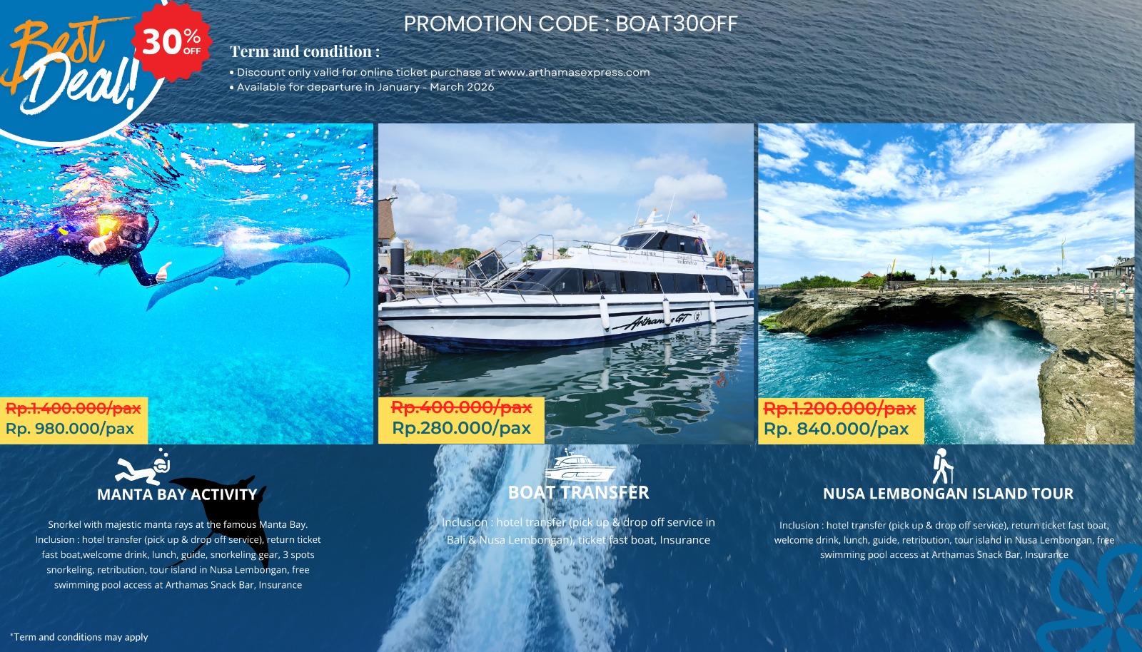 Bali is a fun place to holiday and relax but let you know that there are still many interesting places around Bali that can still be explore. If surfing, snorkeling, sunbathing on the beach enjoying the beauty of nature is your favorite, why not try to visit Nusa Lembongan, Nusa Ceningan, and Nusa Penida together with ARTHAMAS EXPRESS